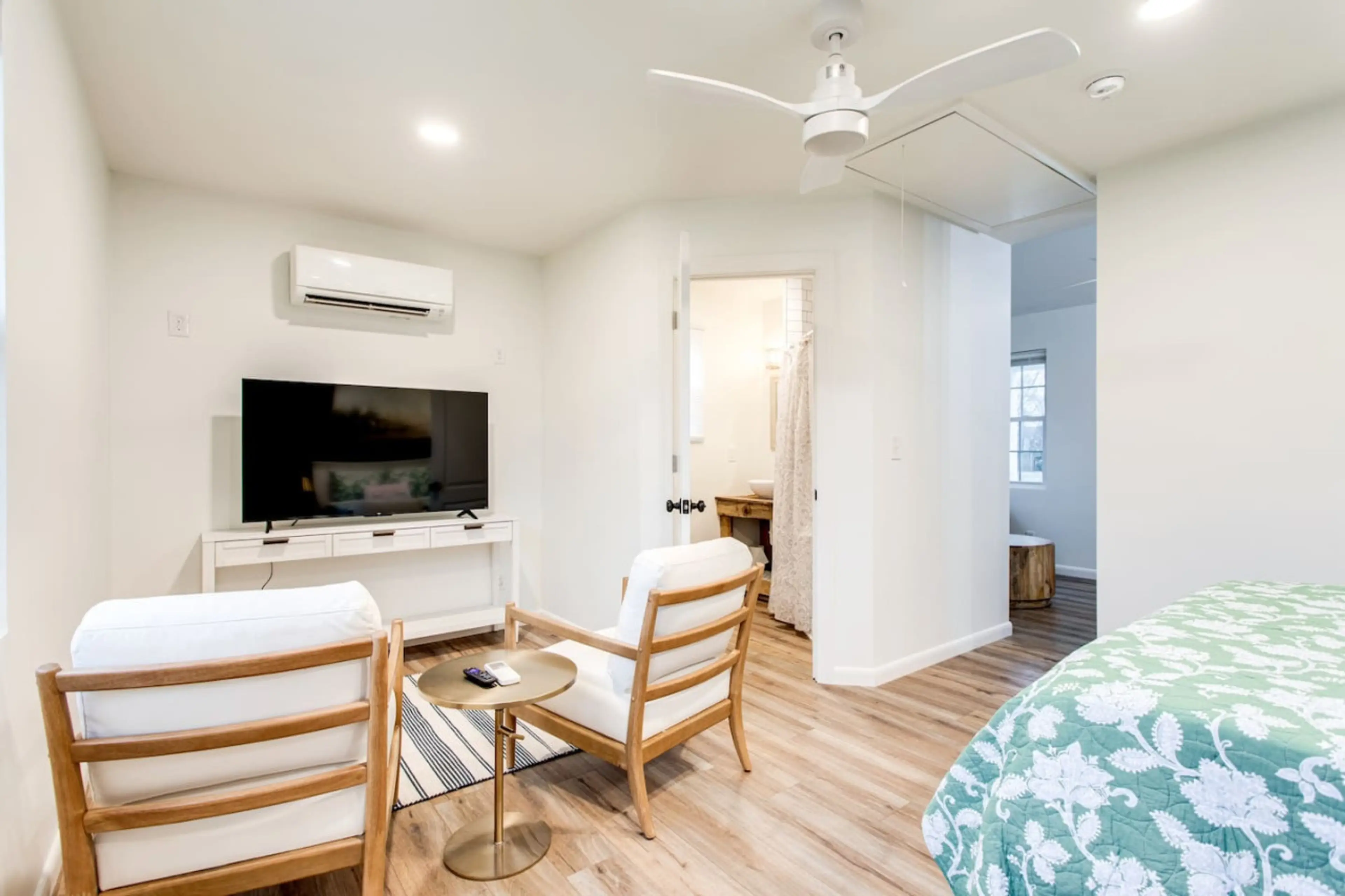 This upscale guest house is perfect for one or two travelers. The unit is completely separate with no shared spaces and even has its own private outdoor space: Features to Note: *Fire pit *Queen bedroom with ensuite bathroom *Two Smart T.Vs one in the bedroom, one in the living room. *Kitchenette *W...